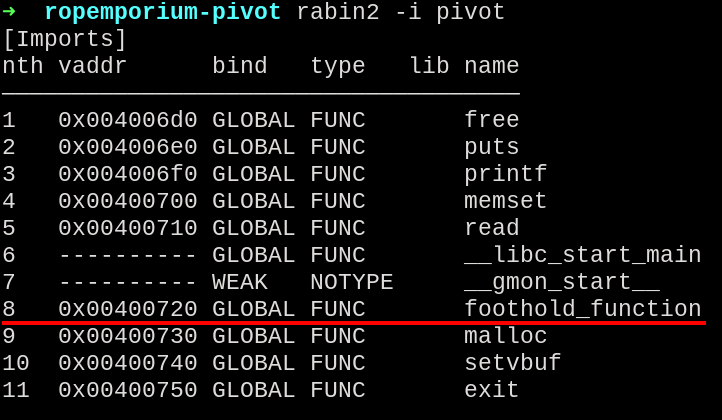 Looking into the program imports using rabin2, there ir no ret2win function, but we have the foothold_function.