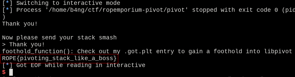 Coming out with the final exploit, we got the flag.