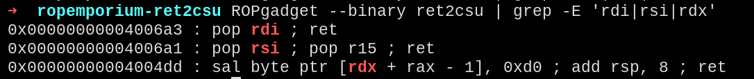 ROPgadget --binary ret2csu | grep -E 'rdi|rsi|rdx'