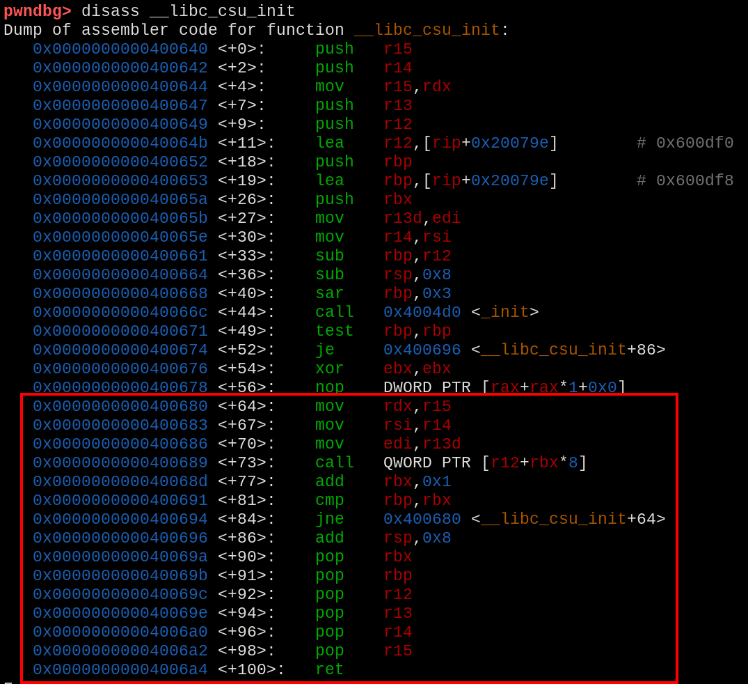r15, so it will be moved tordx; - Gadget of the first half of csu function, to perform the moves and fill the parameter registers;