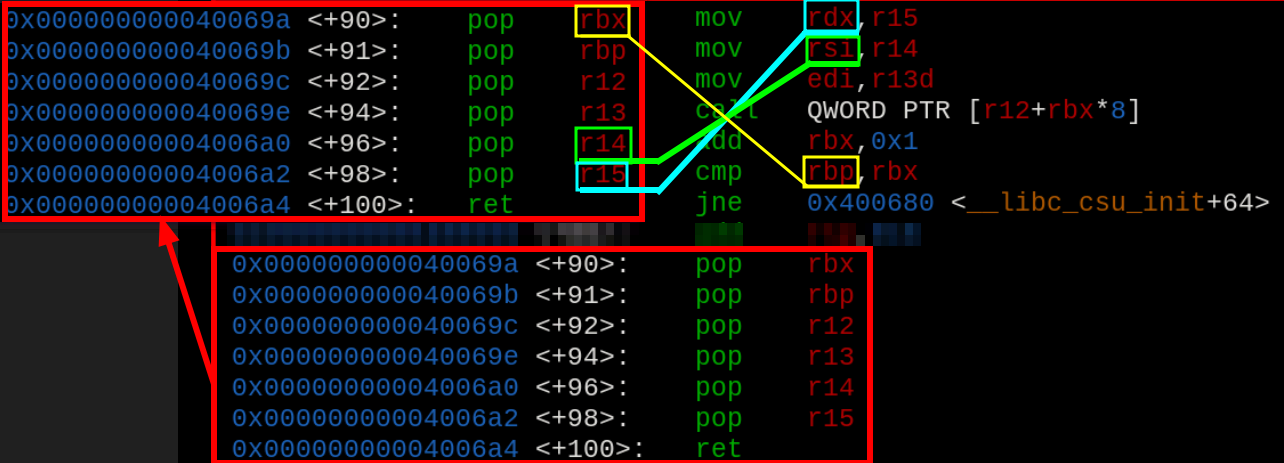 From here, we will first call the second section of the __libc_csu_init function we’ve mentioned before, starting at +90, to fill the registers that will, in the first section of the function, send their values to our parameter registers.